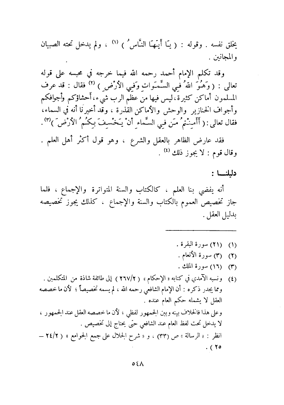 4 ونسبه الآمدي في كتابه "الإحكام": "2/267" إلى طائفة شاذة من المتكلمين، ومما يجدر ذكره: أن الإمام الشافعي رحمه الله، لم يسمه تخصيصًا؛ لأن ما خصصه العقل لا يشمله حكم العام عنده.