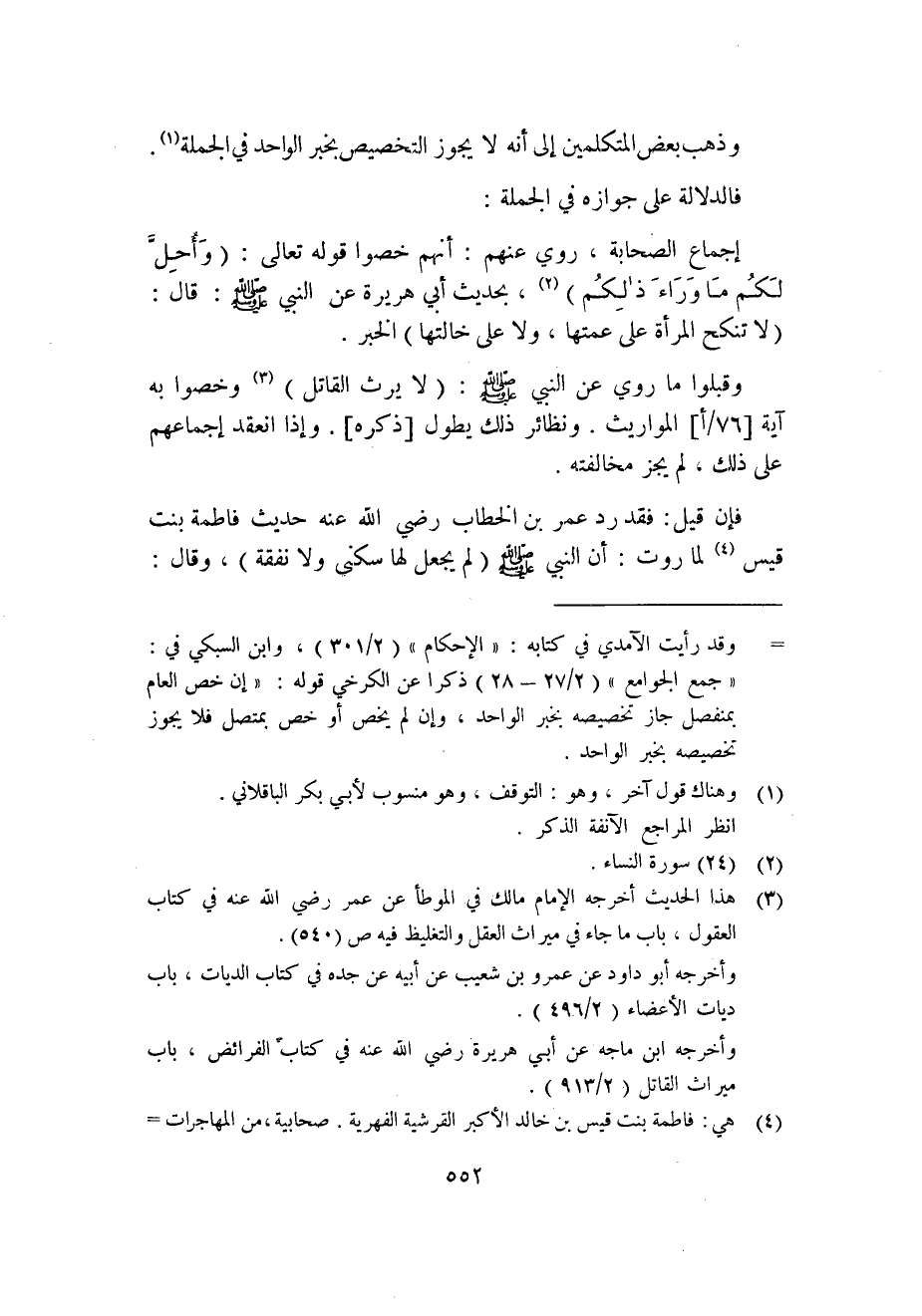 وقبلوا ما روي عن النبي صلى الله عليه وسلم: "لا يرث القاتل" 3 وخصوا به آية [76/أ] المواريث، ونظائر ذلك يطول [ذكره] ، وإذا انعقد إجماعهم على ذلك؛ لم يجز مخالفته.