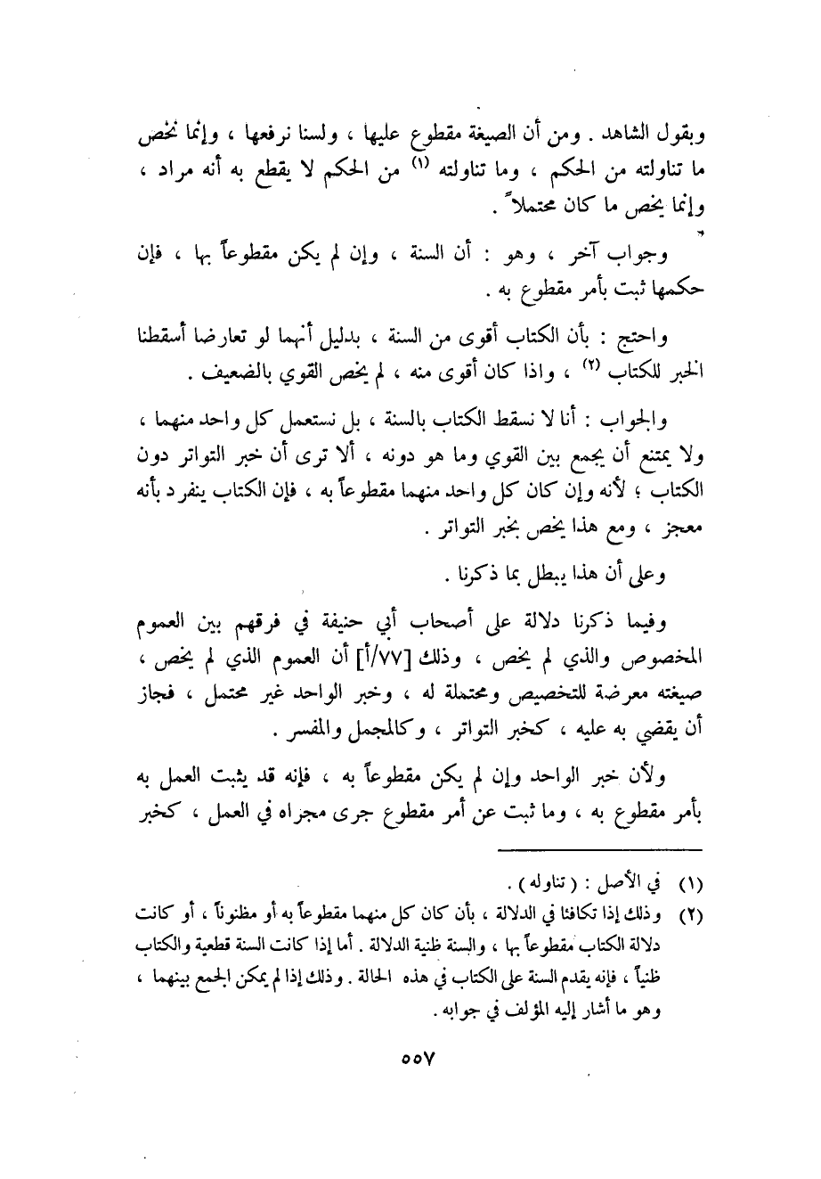 2 وذلك إذا تكافئا في الدلالة، بأن كان كل منهما مقطوعًا به أو مظنونًا، أو كانت دلالة الكتاب مقطوعًا بها، والسنة ظنية الدلالة، أما إذا كانت السنة قطعية والكتاب ظنيًا؛ فإنه يقدم السنة على الكتاب في هذه الحالة، وذلك إذا لم يمكن الجمع بينهما، وهو ما أشار إليه المؤلف في جوابه.