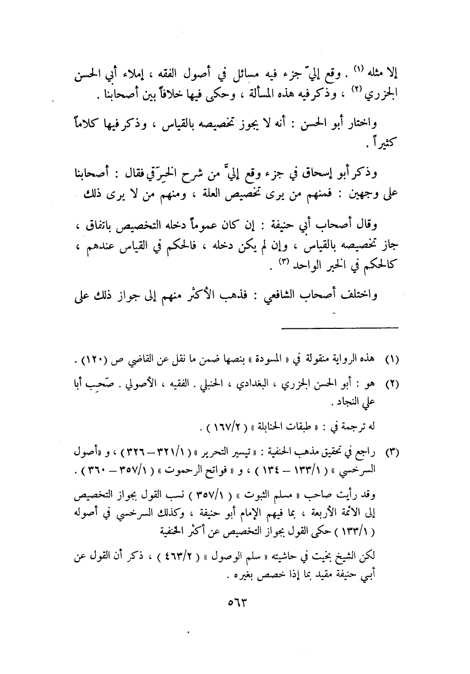 وقد رأيت صاحب "مسلم الثبوت": "1/357" نسب القول بجواز التخصيص إلى الأئمة الأربعة، بما فيهم الإمام أبو حنيفة، وكذلك السرخسي في أصوله "1/133" حكى القول بجواز التخصيص عن أكثر الحنفية.