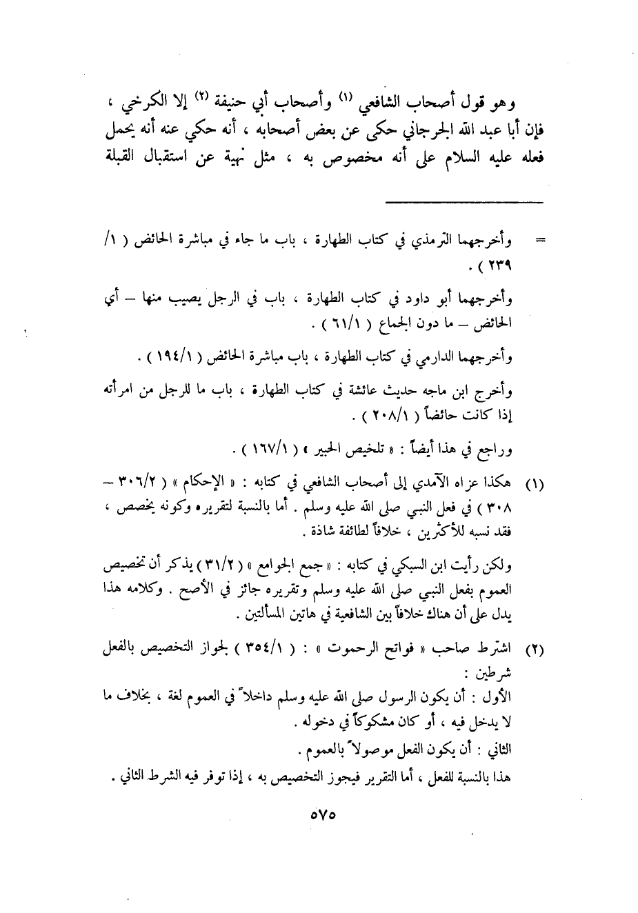 1 هكذا عزاه الآمدي إلى أصحاب الشافعي في كتابه: "الإحكام": "2/306-308" في فعل النبي صلى الله عليه وسلم. أما بالنسبة لتقريره وكونه يخصص؛ فقد نسبه للأكثرين، خلافًا لطائفة شاذة.