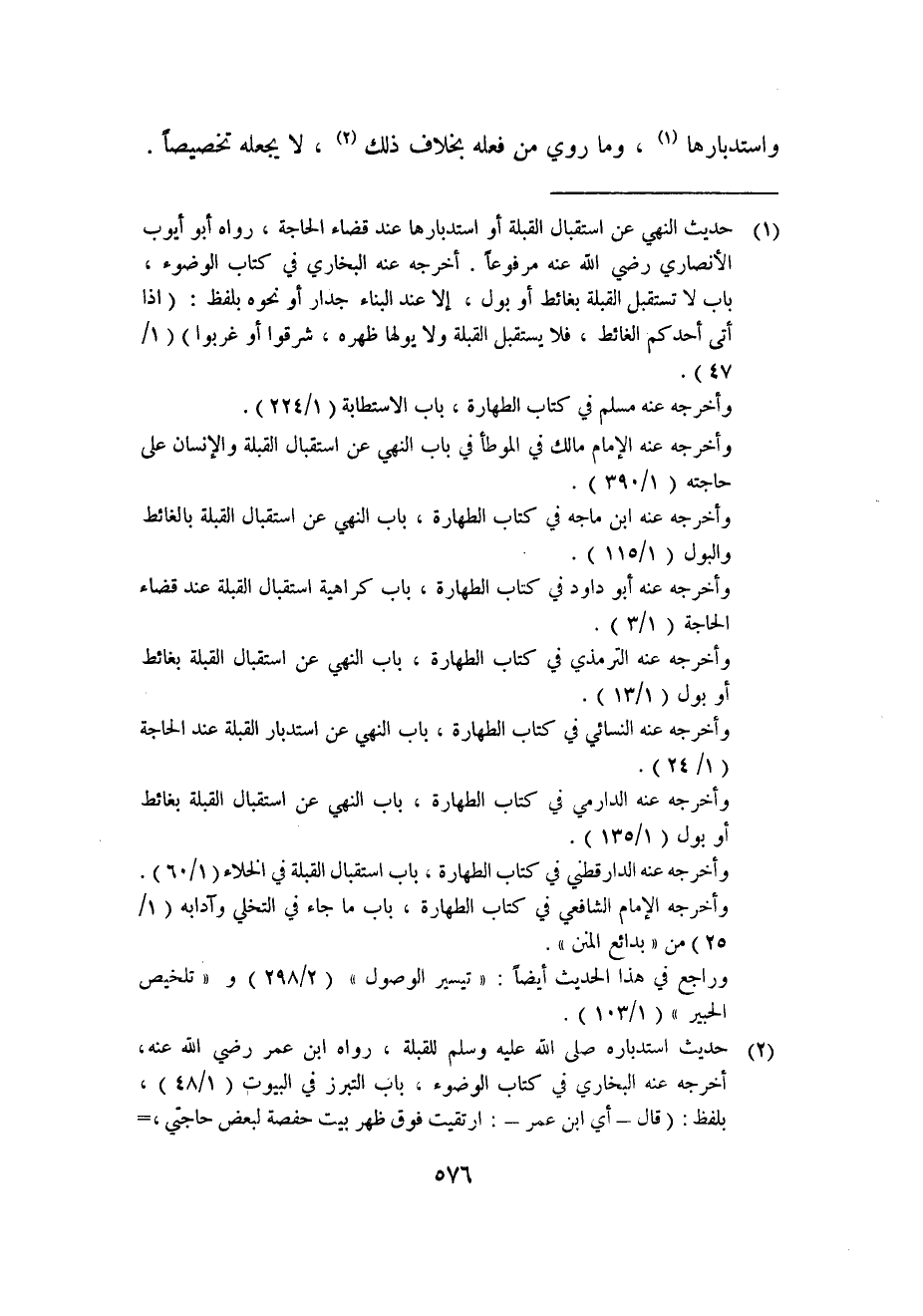 1 حديث النهي عن استقبال القبلة أو استدبارها عند قضاء الحاجة، رواه أبو أيوب الأنصاري رضي الله عنه مرفوعًا، أخرجه عنه البخاري في كتاب الوضوء، باب لا تستقبل القبلة بغائط أو بول، إلا عند البناء جدار أو نحوه بلفظ: "إذا أتى أحدكم الغائط، فلا يستقبل القبلة ولا يولها ظهره؛ شرقوا أو غربوا": "1/47".