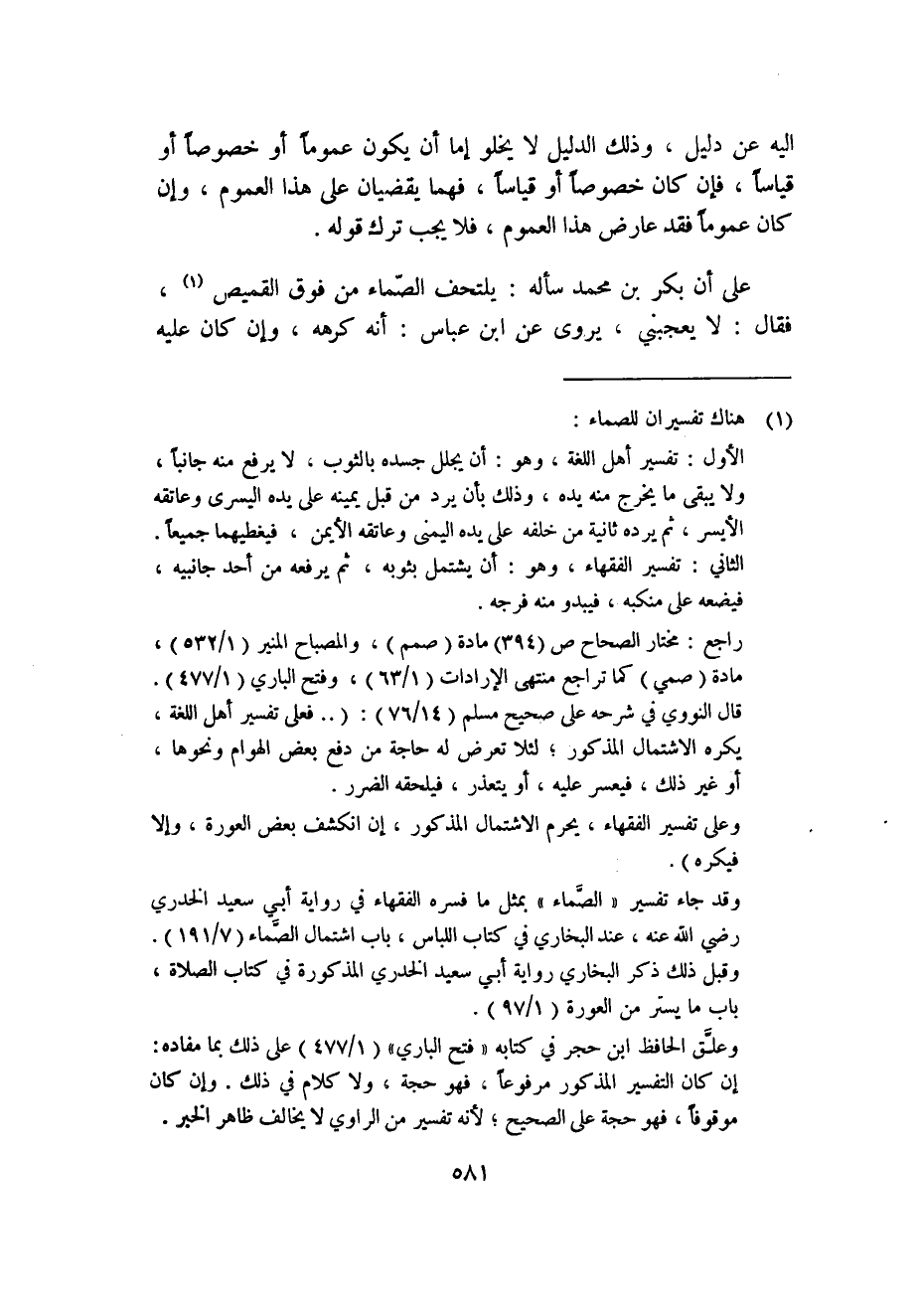 راجع: مختار الصحاح ص"394" مادة "صمم"، والمصباح المنير "1/532"، مادة "صمي" كما تراجع "منتهى الإرادات": "1/63"، وفتح الباري "1/477". قال النووي في شرحه على صحيح مسلم "14/76": ".. فعلى تفسير أهل اللغة، يكره الاشتمال المذكور؛ لئلا تعرض له حاجة من دفع بعض الهوام ونحوها، أو غير ذلك؛ فيعسر عليه، أو يتعذر، فيلحقه الضرر.