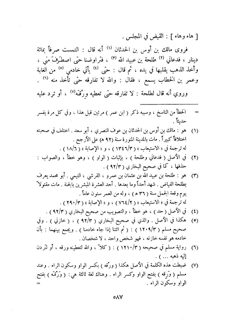 فروى مالك بن أوس بن الحدثان1 أنه قال: التمست صرفًا بمائة دينار، فدعاني2 طلحة بن عبيد الله3، فتراوضنا حتى اصطرف مني، وأخذ الذهب يقلبها في يده، ثم قال: حتى4 يأتي خادمي5 من الغابة وعمر بن الخطاب يسمع؛ فقال: والله لا تفارقه حتى تأخذ منه6.
