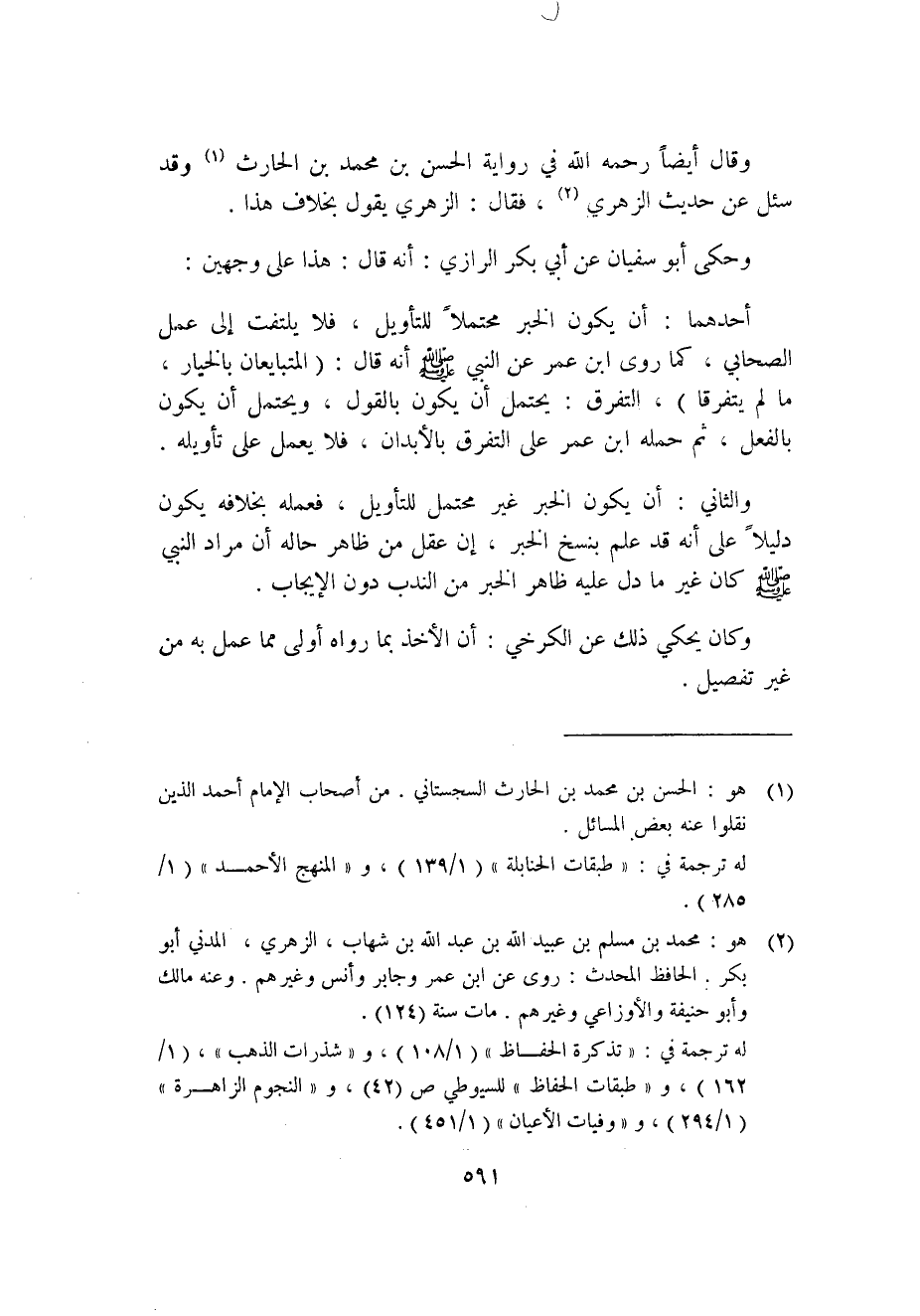 وقال أيضًا رحمه الله في رواية الحسن بن محمد بن الحارث1 وقد سئل عن حديث الزهري2، فقال: الزهري يقول بخلاف هذا.