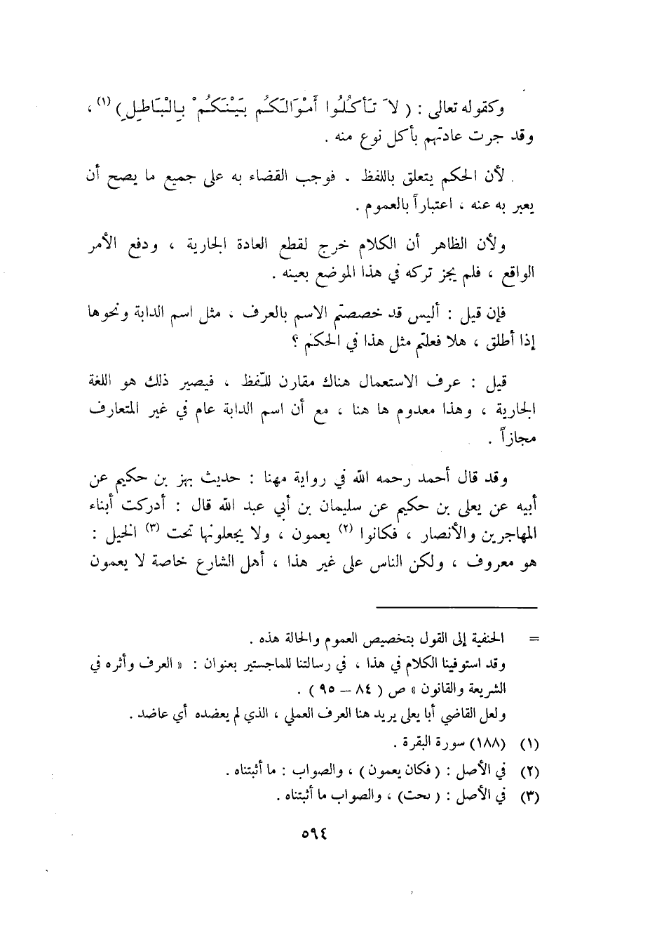 فإن قيل: أليس قد خصصتم الاسم بالعرف، مثل اسم الدابة ونحوها إذا أطلق؛ هلا فعلتم مثل هذا في الحكم؟