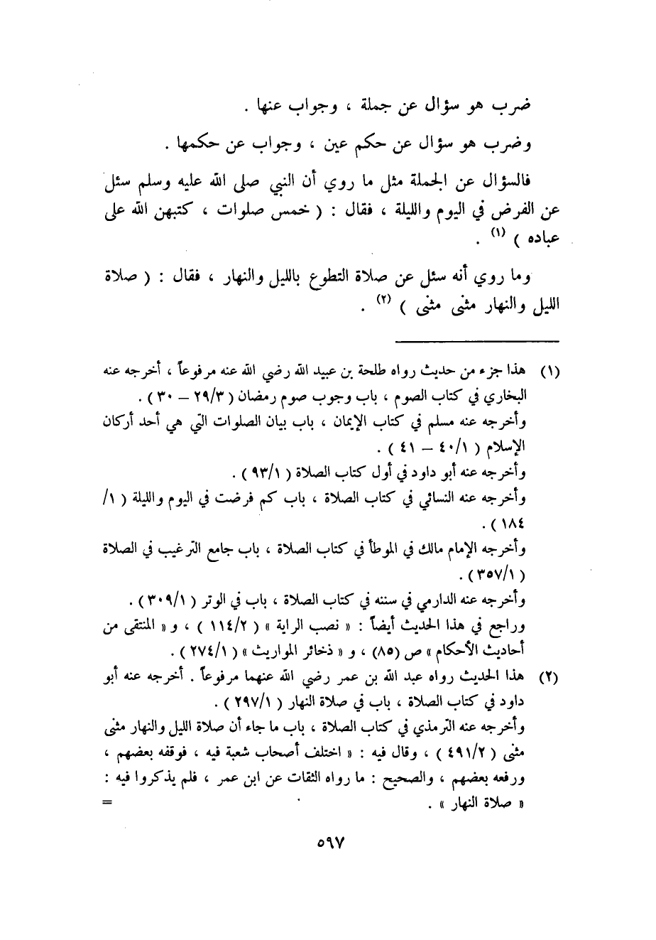 فالسؤال عن الجملة مثل ما روي أن النبي صلى الله عليه وسلم سئل عن الفرض في اليوم والليلة؛ فقال: "خمس صلوات، كتبهن الله على عباده" 1.