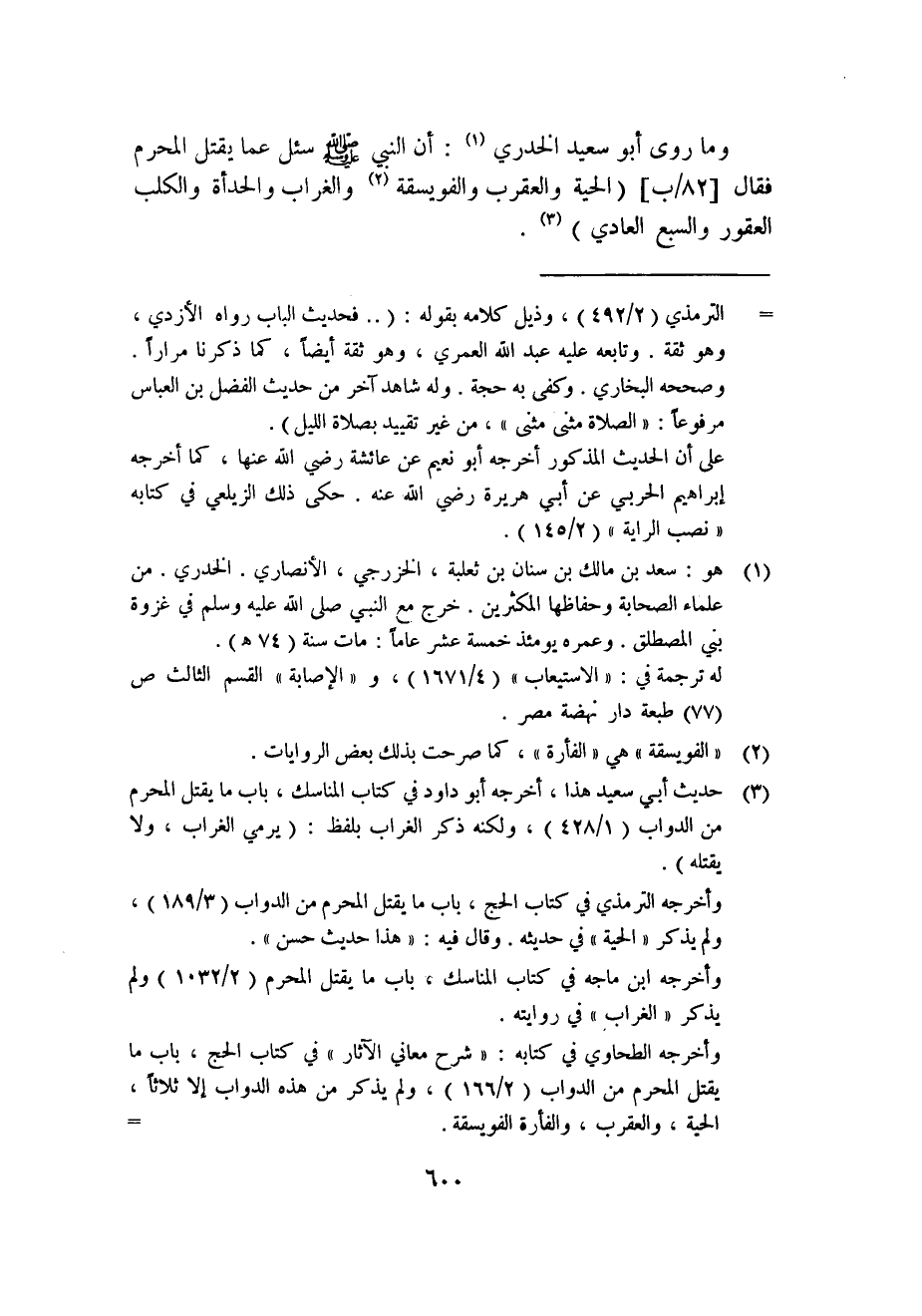 3 حديث أبي سعيد هذا؛ أخرجه أبو داود في كتاب المناسك، باب ما يقتل المحرم من الدواب "1/428"، ولكنه ذكر الغراب بلفظ: "يرمي الغراب، ولا يقتله".
