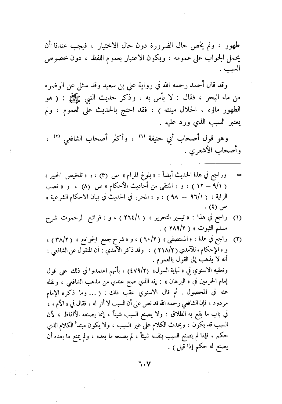 وقد قال أحمد رحمه الله في رواية علي بن سعيد وقد سئل عن الوضوء من ماء البحر؛ فقال: لا بأس به، وذكر حديث النبي صلى الله عليه وسلم: "هو الطهور ماؤه، الحلال ميتته"؛ فقد احتج بالحديث على العموم، ولم يعتبر السبب الذي ور عليه.