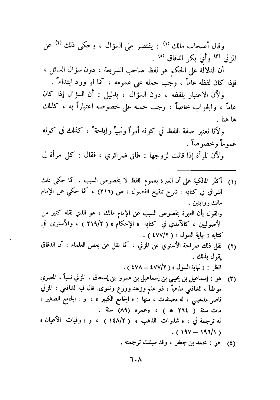 1 أكثر المالكية على أن العبرة بعموم اللفظ لا بخصوص السبب، كما حكى ذلك القرافي في كتابه "شرح تنقيح الفصول" ص"216"، كما حكي عن الإمام مالك روايتين.