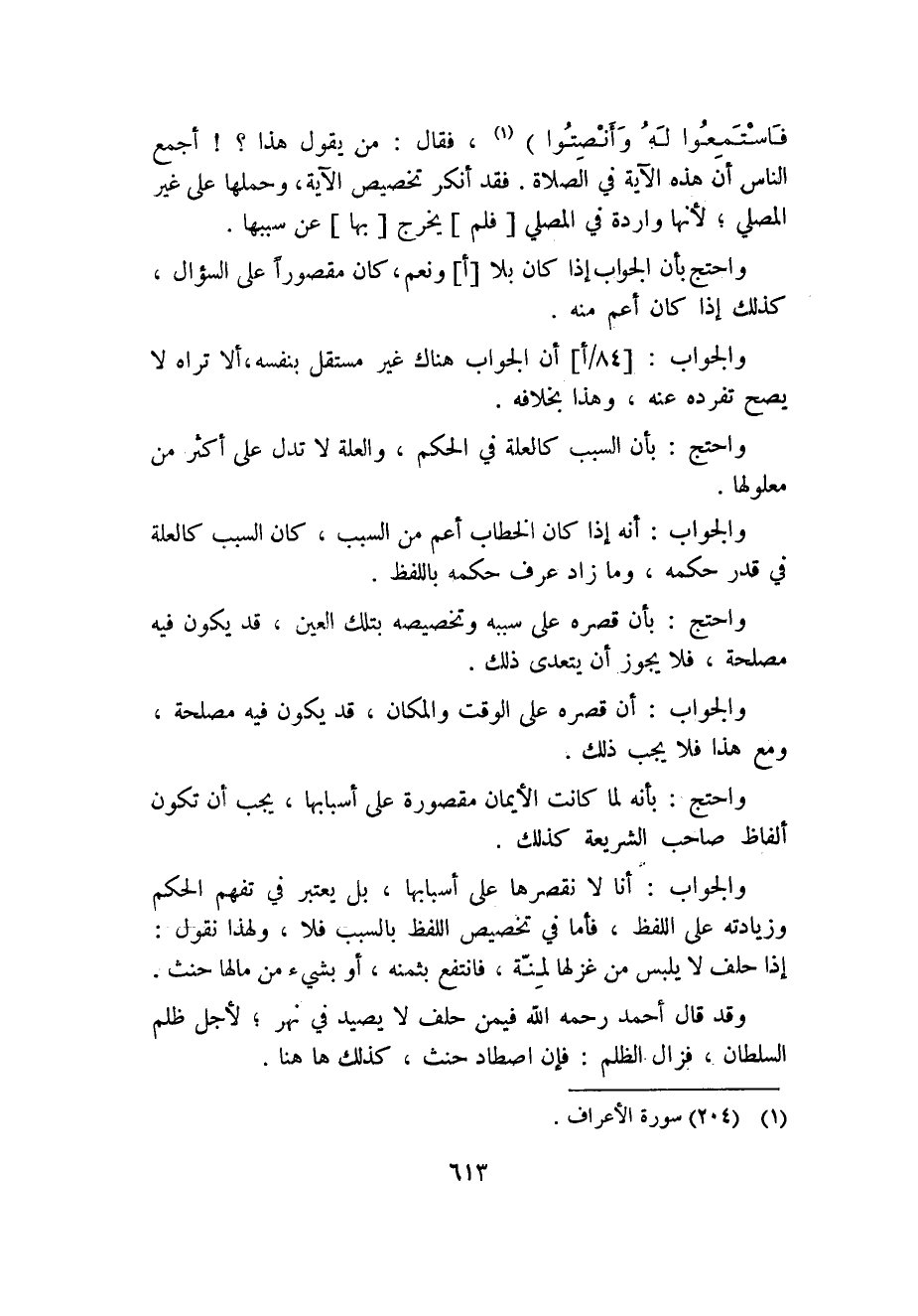فَاسْتَمِعُوا لَهُ وَأَنصِتُوا} 1، فقال: من يقول هذا؟! أجمع الناس أن هذه الآية في الصلاة. فقد أنكر تخصيص الآية، وحملها على غير المصلي؛ لأنها واردة في المصلي؛ [فلم] يخرج [بها] عن سببها.