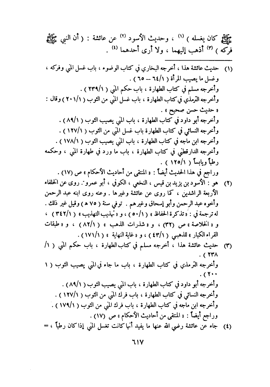 1 حديث عائشة هذا، أخرجه البخاري في كتاب الوضوء، باب غسل المني وفركه، وغسل ما يصيب المرأة "1/64-65".