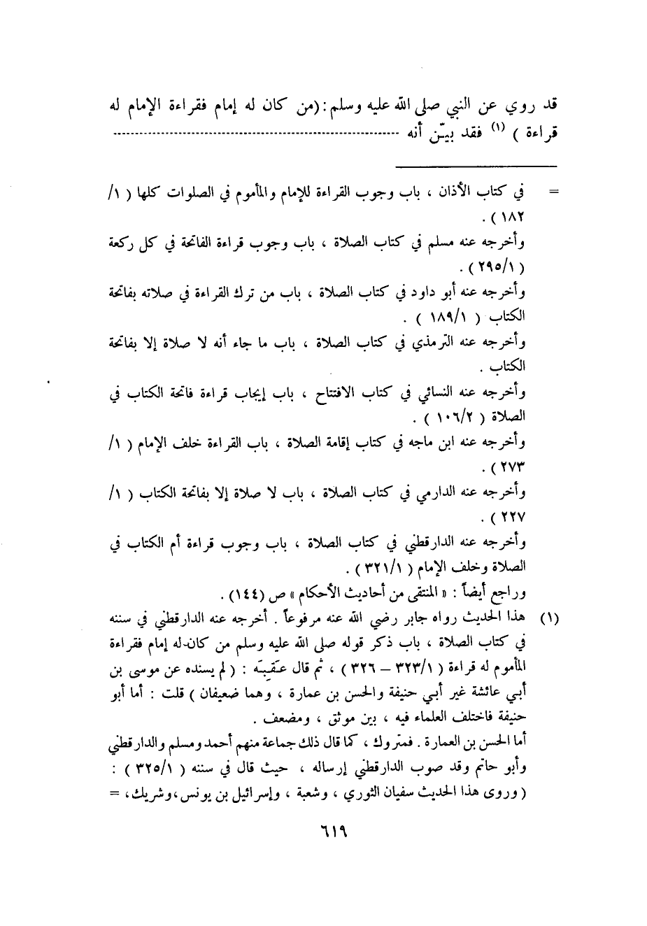 1 هذا الحديث رواه جابر رضي الله عنه مرفوعًا. أخرجه عنه الدارقطني في سننه في كتاب الصلاة، باب ذكر قوله صلى الله عليه وسلم: "من كان له إمام فقراءة المأموم له قراءة ": 1/323-326"، ثم قال عقبة: "لم يسنده عن موسى بن أبي عائشة غير أبي حنيفة والحسن بن عمارة، وهما ضعيفان" قلت: أما أبو حنيفة فاختلف العلماء فيه، بين موثق، ومضعف.