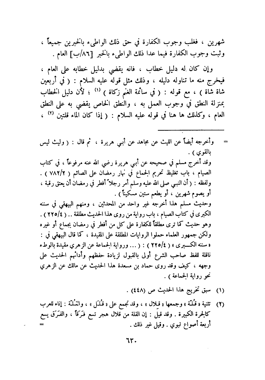 شهرين؛ فغلب وجوب الكفارة في حق ذلك الواطئ بالخبرين جميعًا، وثبت وجوب الكفارة فيما عدا ذلك الواطئ بالخبر [86/ب] العام.