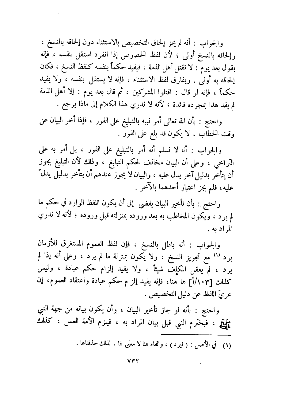 والجواب: أنه لم يجز إلحاق التخصيص بالاستثناء دون إلحاقه بالنسخ، وإلحاقه بالنسخ أولى، لأن لفظ الخصوص إذا انفرد استقل بنفسه، فإنه يقول بعد يوم: لاتقتل أهل الذمة فيفيد حكماً بنفسه كلفظ النسخ، فكان إلحاقه به أولى. ويفارق لفظ الاستثناء، فإنه لا يستقل بنفسه، ولا يفيد حكماً، فإنه لو قال: اقتلوا المشركين، ثم قال بعد يوم: إلا أهل الذمة لم يفد هذا بمجرده فائدة، لأنه لا ندري هذا الكلام إلى ماذا يرجع.