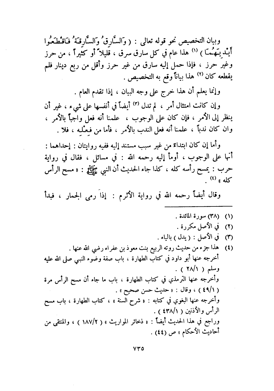 وأما إن كان ابتداءً من غير سبب مستند إليه ففيه روايتان: إحداهما: أنها على الوجوب، أومأ إليه رحمه الله: في مسائل، فقال في رواية حرب: يمسح رأسه كله، كذا جاء الحديث أن النبي - صلى الله عليه وسلم -: "مسح الرأس كله" (4) .