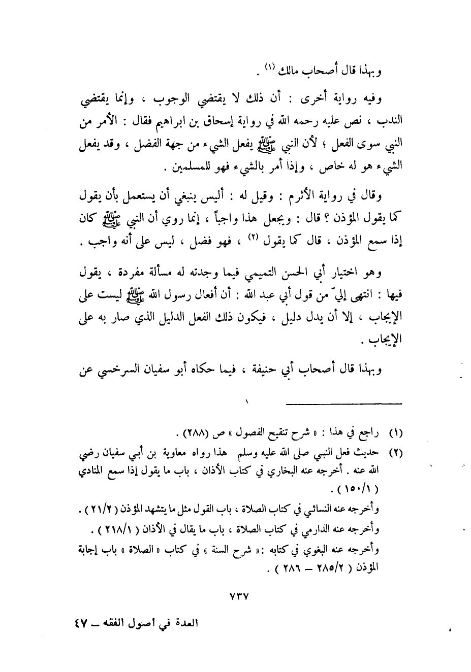 وقال في رواية الأثرم: وقيل له: أليس ينبغي أن يستعمل بأن يقول كما يقول المؤذن؟ قال: ويجعل هذا واجباً، إنما روي أن النبي - صلى الله عليه وسلم - كان إذا سمع المؤذن، قال كما يقول (2) ، فهو فضل، ليس على أنه واجب.