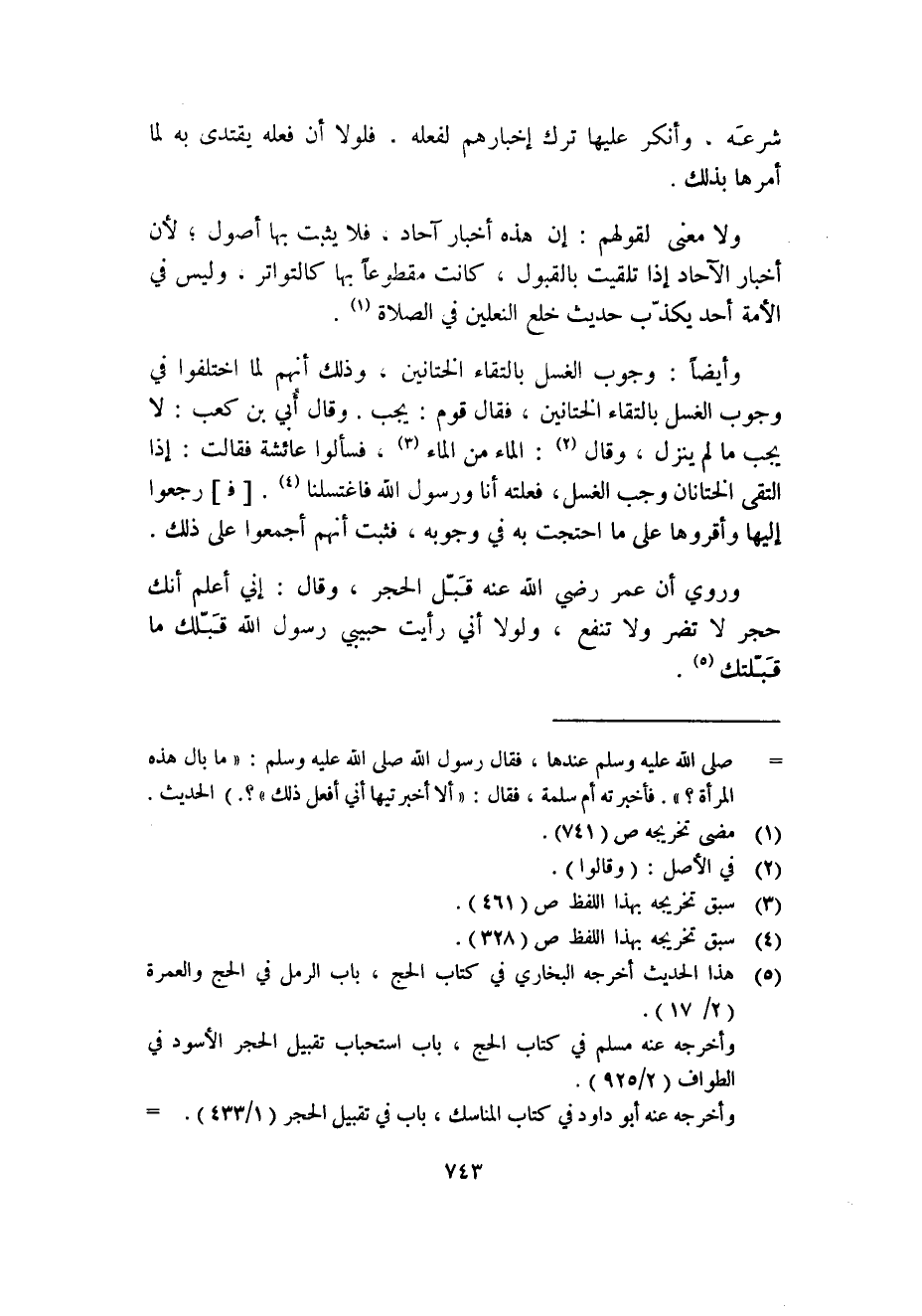 وأيضاً: وجوب الغسل بالتقاء الختانين، وذلك أنهم لما اختلفوا في وجوب الغسل بالتقاء الختانين، فقال قوم: يجب. وقال أُبي بن كعب: لا يجب ما لم ينزل، وقال (2) : الماء من الماء (3) ، فسألوا عائشة فقالت: إذا التقى الختانان وجب الغسل، فعلته أنا ورسول الله فاغتسلنا (4) [فـ] رجعوا إليها وأقروها على ما احتجت به في وجوبه، فثبت أنهم أجمعوا على ذلك.