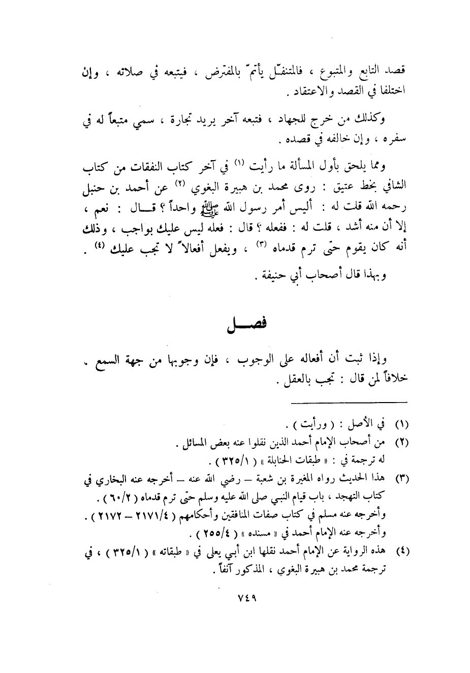 ومما يلحق بأول المسألة ما رأيت (1) في آخر كتاب النفقات من كتاب الشافي بخط عتيق: روى محمد بن هبيرة البغوي (2) عن أحمد بن حنبل رحمه الله قلت له: أليس أمر رسول الله - صلى الله عليه وسلم - واحداً؟ قال: نعم، إلا أن منه أشد، قلت له: ففعله؟ قال: فعله ليس عليك بواجب، وذلك أنه كان يقوم حتى ترم قدماه (3) ، ويفعل أفعالا لا تجب عليك (4) .