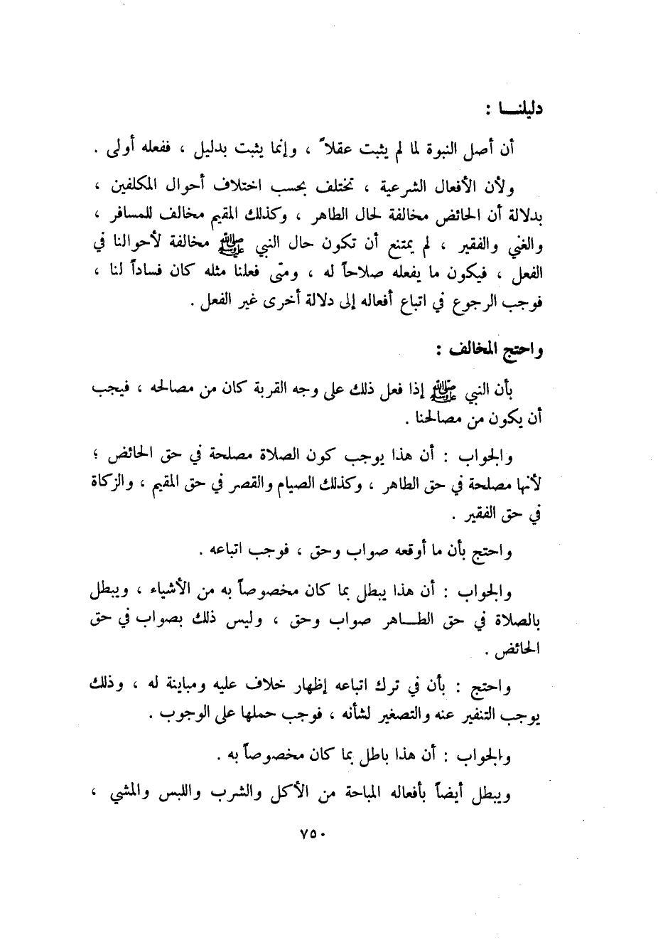 ولأن الأفعال الشرعية، تختلف بحسب اختلاف أحوال المكلفين، بدلالة أن الحائض مخالفة لحال الطاهر، وكذلك المقيم مخالف للمسافر، والغني والفقير، لم يمتنع أن تكون حال النبي - صلى الله عليه وسلم - مخالفة لأحوالنا في الفعل، فيكون ما يفعله صلاحاً له، ومتى فعلنا مثله كان فساداً لنا، فوجب الرجوع في اتباع أفعاله إلى دلالة أخرى غير الفعل.