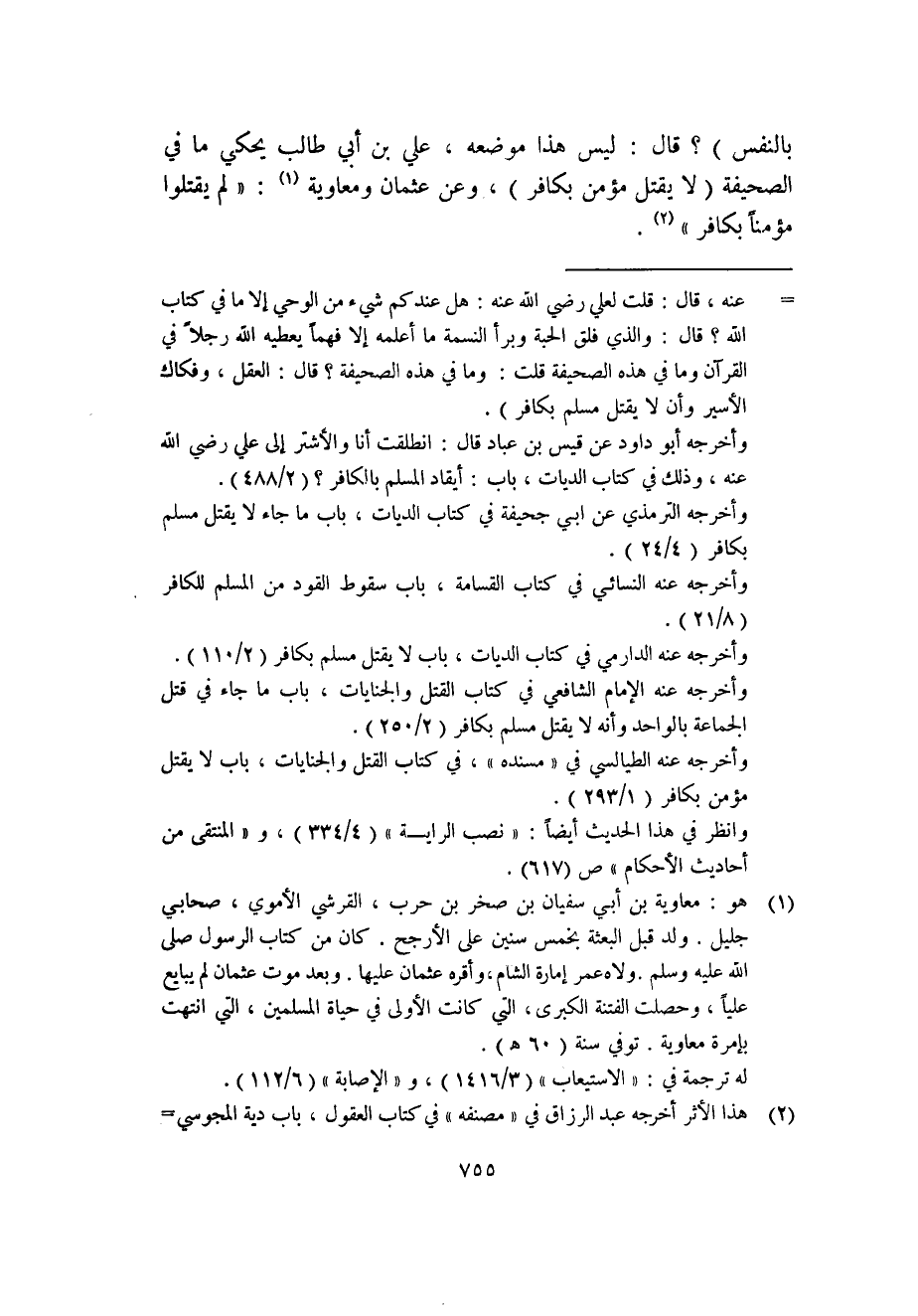 بالنفس) ؟ قال: ليس هذا موضعه، علي بن أبي طالب يحكي ما في الصحيفة (لا يقتل مؤمن بكافر) ، وعن عثمان ومعاوية (1) : "لم يقتلوا مؤمناً بكافر" (2) .