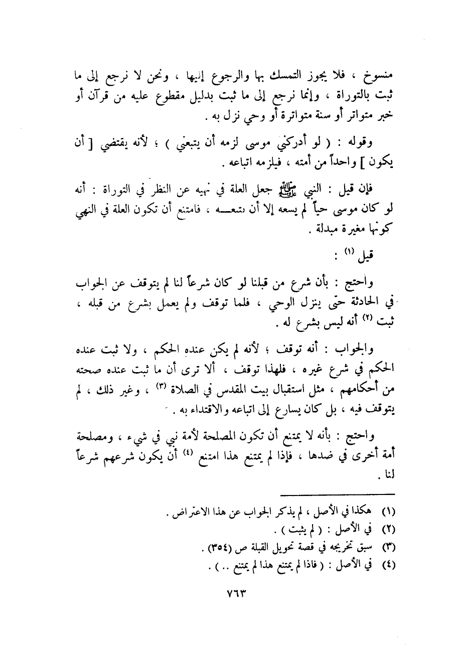 فإن قيل: النبي - صلى الله عليه وسلم - جعل العلة في نهيه عن النظر في التوراة: أنه لو كان موسى حيا لم يسعه إلا أن يتبعه، فامتنع أن تكون العلة في النهي كونها مغيرة مبدلة.