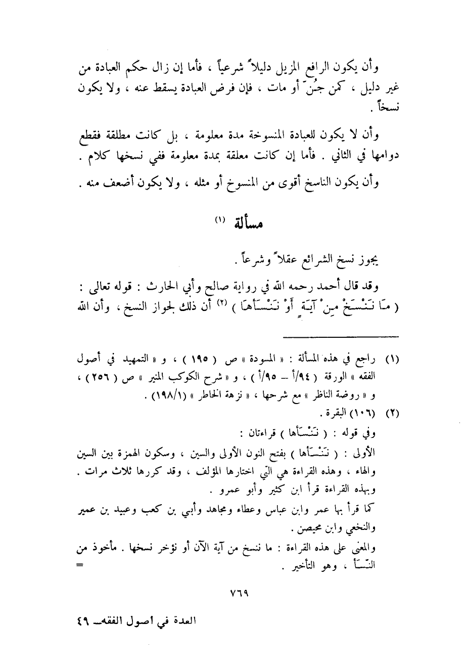 وقد قال أحمد رحمه الله في رواية صالح وأبي الحارث: قوله تعالى: (ما نَنْسَخْ منْ آيَةٍ أَوْ نَنْسَأهَا) (2) أن ذلك لجواز النسخ، وأن الله