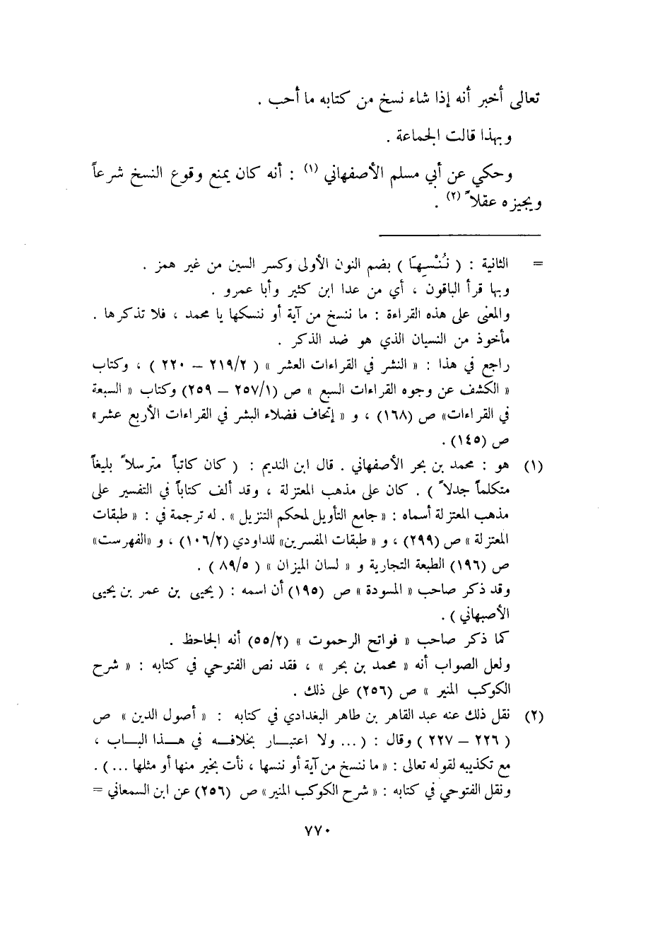 (2) نقل ذلك عنه عبد القاهر بن طاهر البغدادي في كتابه: "أصول الدين" ص (226-227) وقال: ( ... ولا اعتبار بخلافه في هذا الباب، مع تكذيبه لقوله تعالى: "ما ننسخ من آية أو ننسها، نأت بخير منها أو مثلها ... ) .