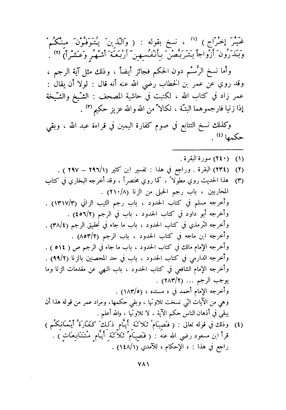 وأما نسخ الرسْم دون الحكم فجائز أيضاً، وذلك مثل آية الرجم، وقد روي عن عمر بن الخطاب رضي الله عنه أنه قال: لولا أن يقال: عمر زاد في كتاب الله، لكتبت في حاشية المصحف: الشّيخ والشّيخة إذا زنيا فارجموهما البتّة، نكالاً من الله والله عزيز حكيم (3) .