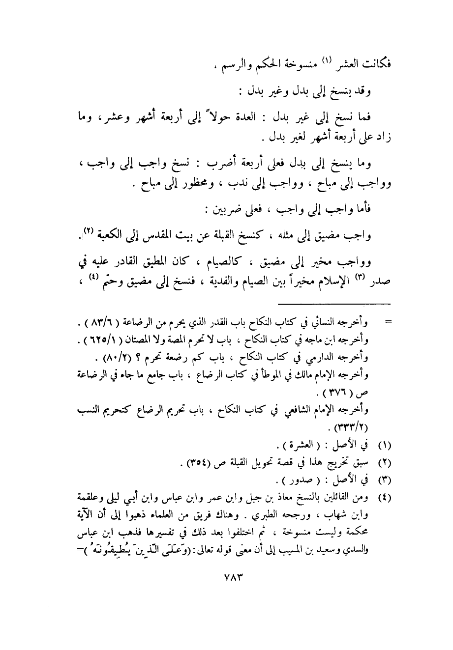 وما ينسخ إلى بدل فعلى أربعة أضرب: نسخ واجب إلى واجب، وواجب إلى مباح، وواجب إلي ندب، ومحظور إلى مباح.