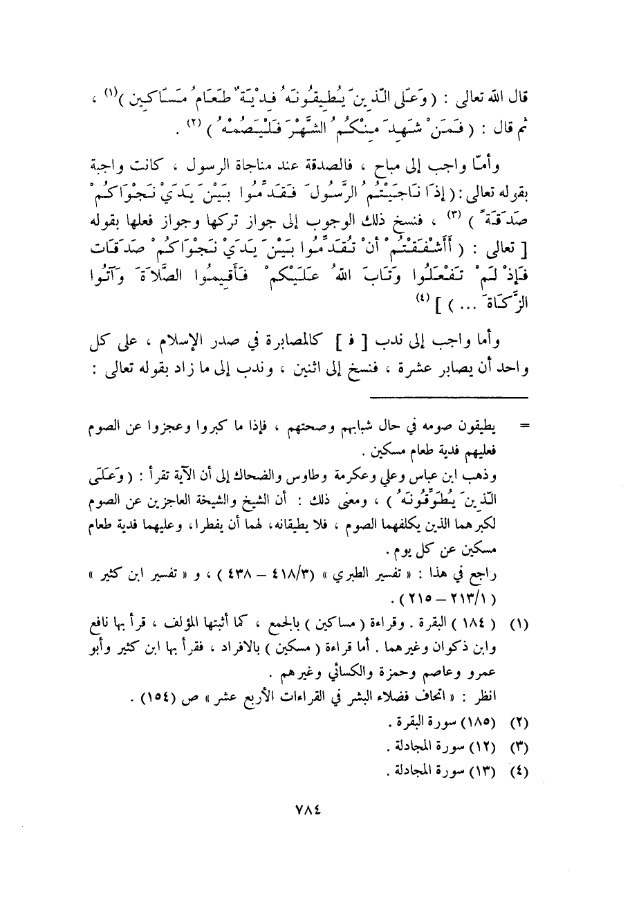 (1) (184) البقرة. وقراءة (مساكين) بالجمع، كما أثبتها المؤلف، قرأ بها نافع وابن ذكوان وغيرهما. أما قراءة (مسكين) بالافراد، فقرأ بها ابن كثير وأبو عمرو وعاصم وحمزة والكسائي وغيرهم.