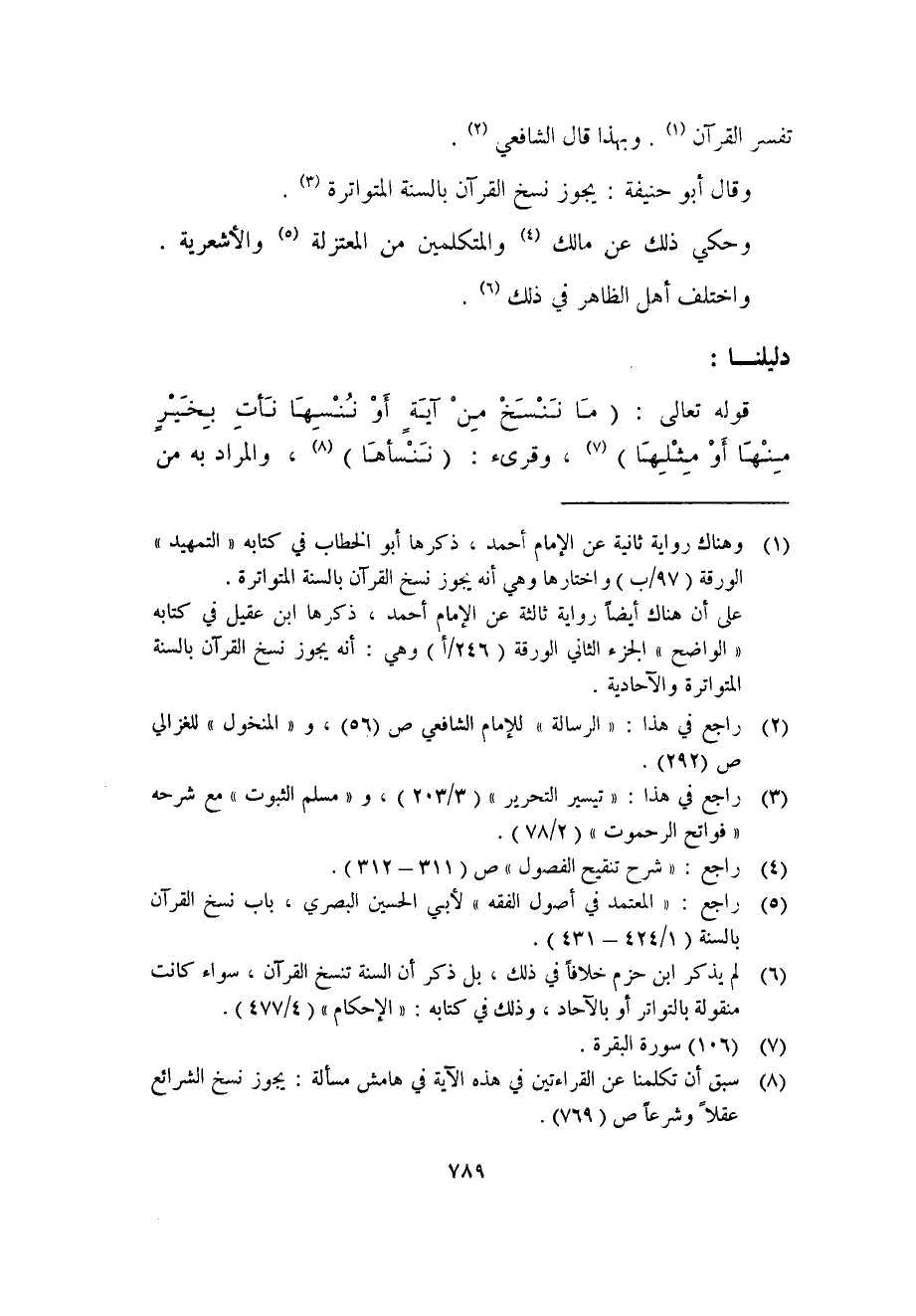 (5) راجع: "المعتمد في أصول الفقه" لأبي الحسين البصري، باب نسخ القرآن بالسنة (1/424-431) .