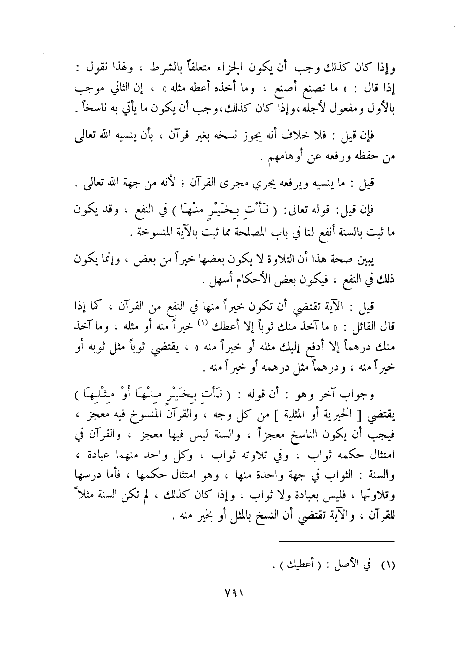 وجواب آخر وهو: أن قوله: (نأتِ بخير منها أو مثلها) يقتضي [الخيرية أو المثلية] من كل وجه، والقرآن المنسوخ فيه معجز، فيجب أن يكون الناسخ معجزاً، والسنة ليس فيها معجز، والقرآن في امتثال حكمه ثواب، وفي تلاوته ثواب، وكل واحد منهما عبادة، والسنة: الثواب في جهة واحدة منها، وهو امتثال حكمها، فأما درسها وتلاوتها، فليس بعبادة ولا ثواب، وإذا كان كذلك، لم تكن السنة مثلاً
