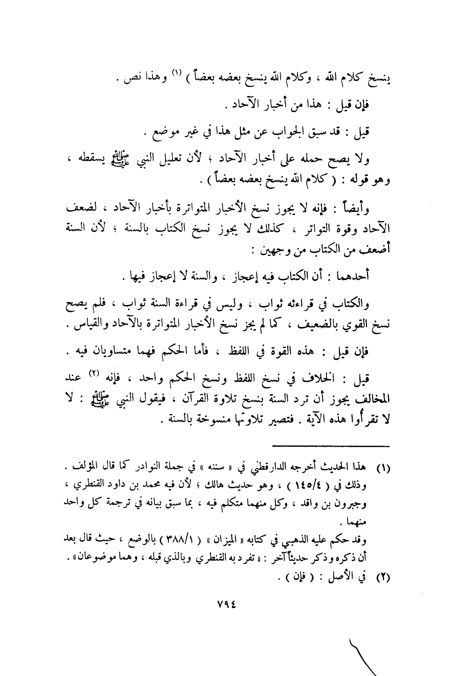 بنسخ كلام الله، وكلام الله ينسخ بعضه بعضاً) (1) وهذا نص.