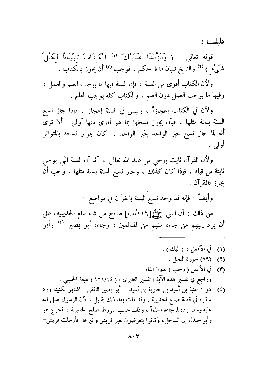 قوله تعالى: (وَنَزَّلْنَا علَيْكَ (1) الْكِتَابَ تِبْيَاناً لِكلِّ شَيْء) (2) والنسخ تبيان مدة الحكم، فوجب (3) أن يجوز بالكتاب.