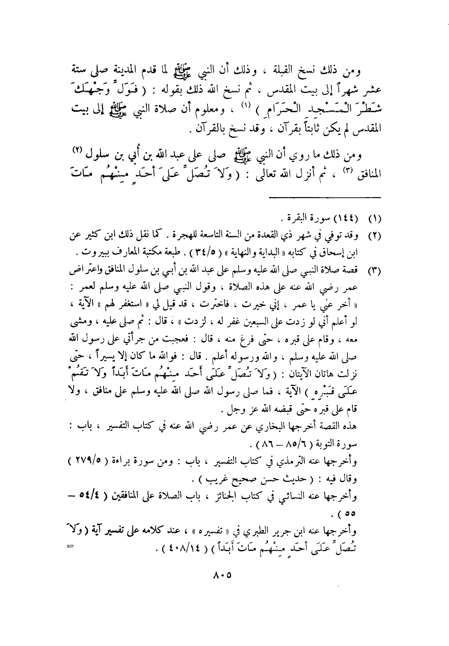 (3) قصة صلاة النبي صلى الله عليه وسلم على عبد الله بن أبي بن سلول المنافق واعتراض عمر رضي الله عنه على هذه الصلاة، وقول النبي صلى الله عليه وسلم لعمر: "أخر عني يا عمر، إني خيرت، فاخترت، قد قيل لي "استغفر لهم" الآية، لو أعلم أني لو زدت على السبعين غفر له، لزدت"، قال: ثم صلى عليه، ومشى معه، وقام على قبره، حتى فرغ منه، قال: فعجبت من جرأتي على رسول الله صلى الله عليه وسلم، والله ورسوله أعلم. قال: فوالله ما كان إلا يسيراً، حتى نزلت هاتان الآيتان: (وَلاَ تُصَلِّ عَلَى أَحَدٍ مِنْهُم مَاتَ أبَداً وَلاَ تَقُمْ عَلَى قبرِهِ) الآية، فما صلى رسول الله صلى الله عليه وسلم على منافق، ولا قام على قبره حتى قبضه الله عز وجل.