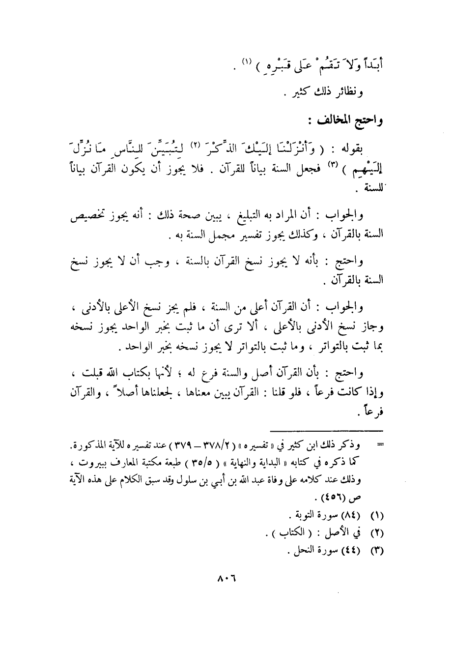 بقوله: (وَأنْزَلْنَا إلَيْكَ الذِّكْرَ (2) لِتُبَيِّنَ لِلنَّاسِ مَا نُزِّلَ إِلَيْهِم) (3) فجعل السنة بياناً للقرآن. فلا يجوز أن يكون القرآن بياناً للسنة.