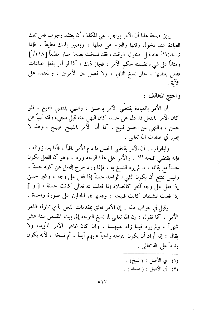 والجواب: أن الأمر يقتضي الحسن ما دام الأمر باقياً، فأما بعد زواله، فإنه يقتضي قبحه (2) ، والأمر على هذا الوجه ورد، وهو أن الفعل يكون حسناً مع بقائه، ما لم يرد النسخ به، فإذا ورد خرج الفعل عن كونه حسناً، وليس يمتنع أن يكون الشيء الواحد حسناً إذا فعل على وجه، وغير حسن إذا فعل على وجه آخر كالصلاة إذا فعلت لله تعالى كانت حسنة، [و] إذا فعلت للشيطان كانت قبيحة، وفعلها في الحالين على صورة واحدة.