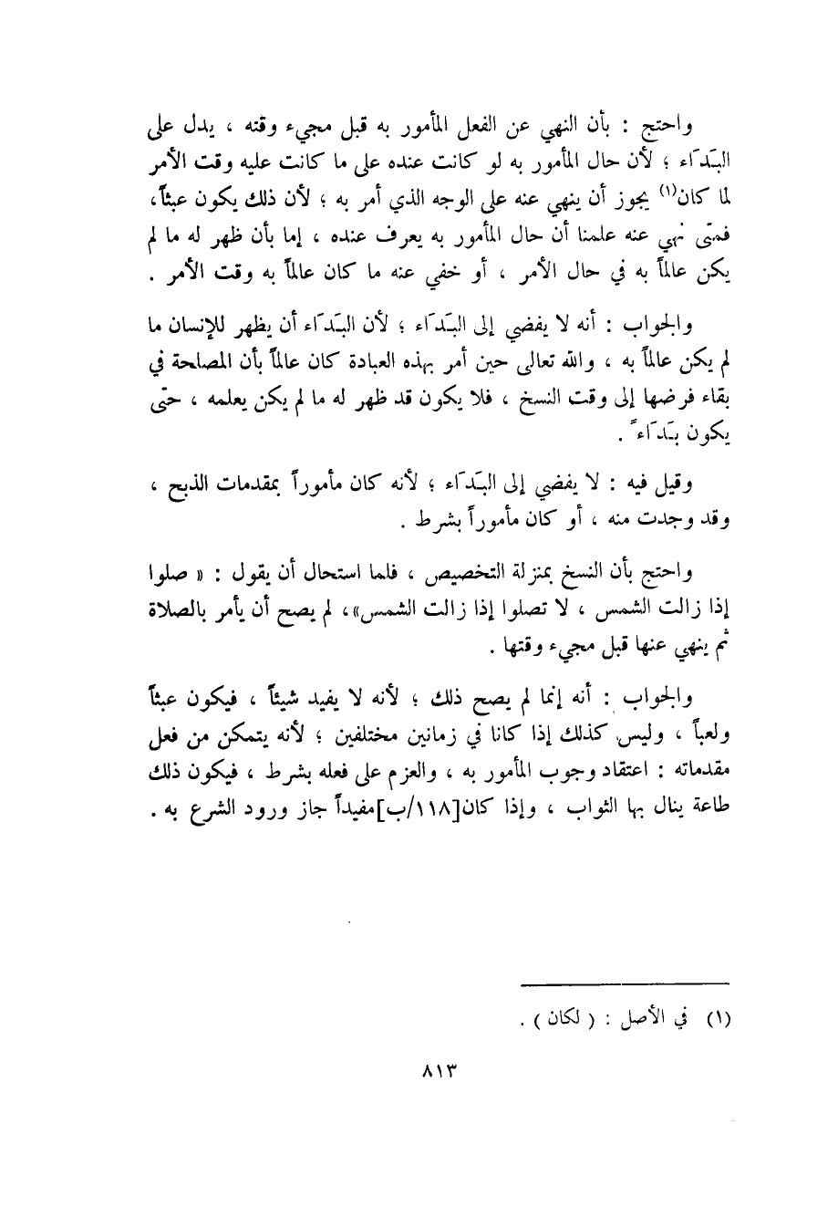 واحتج: بأن النهي عن الفعل المأمور به قبل مجيء وقته، يدل على البداء؛ لأن حال المأمور به لو كانت عنده على ما كانت عليه وقت الأمر لما كان (1) يجوز أن ينهي عنه على الوجه الذي أمر به؛ لأن ذلك يكون عبثاً، فمتى نهي عنه علمنا أن حال المأمور به يعرف عنده، إما بأن ظهر له ما لم يكن عالماً به في حال الأمر، أو خفي عنه ما كان عالماً به وقت الأمر.