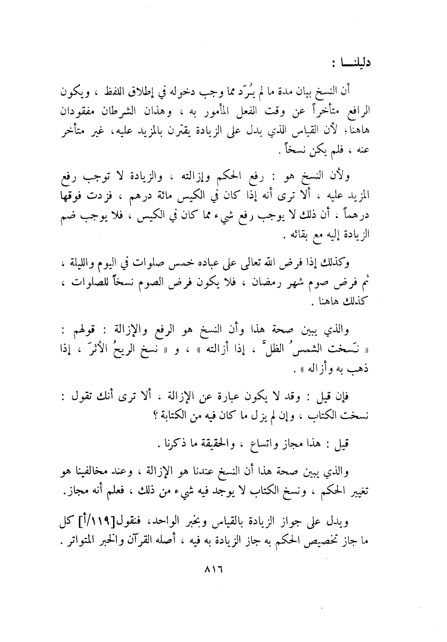ولأن النسخ هو: رفع الحكم وإزالته، والزيادة لا توجب رفع المزيد عليه، ألا ترى أنه إذا كان في الكيس مائة درهم، فزدت فوقها درهماً، أن ذلك لا يوجب رفع شيء مما كان في الكيس، فلا يوجب ضم الزيادة إليه مع بقائه.