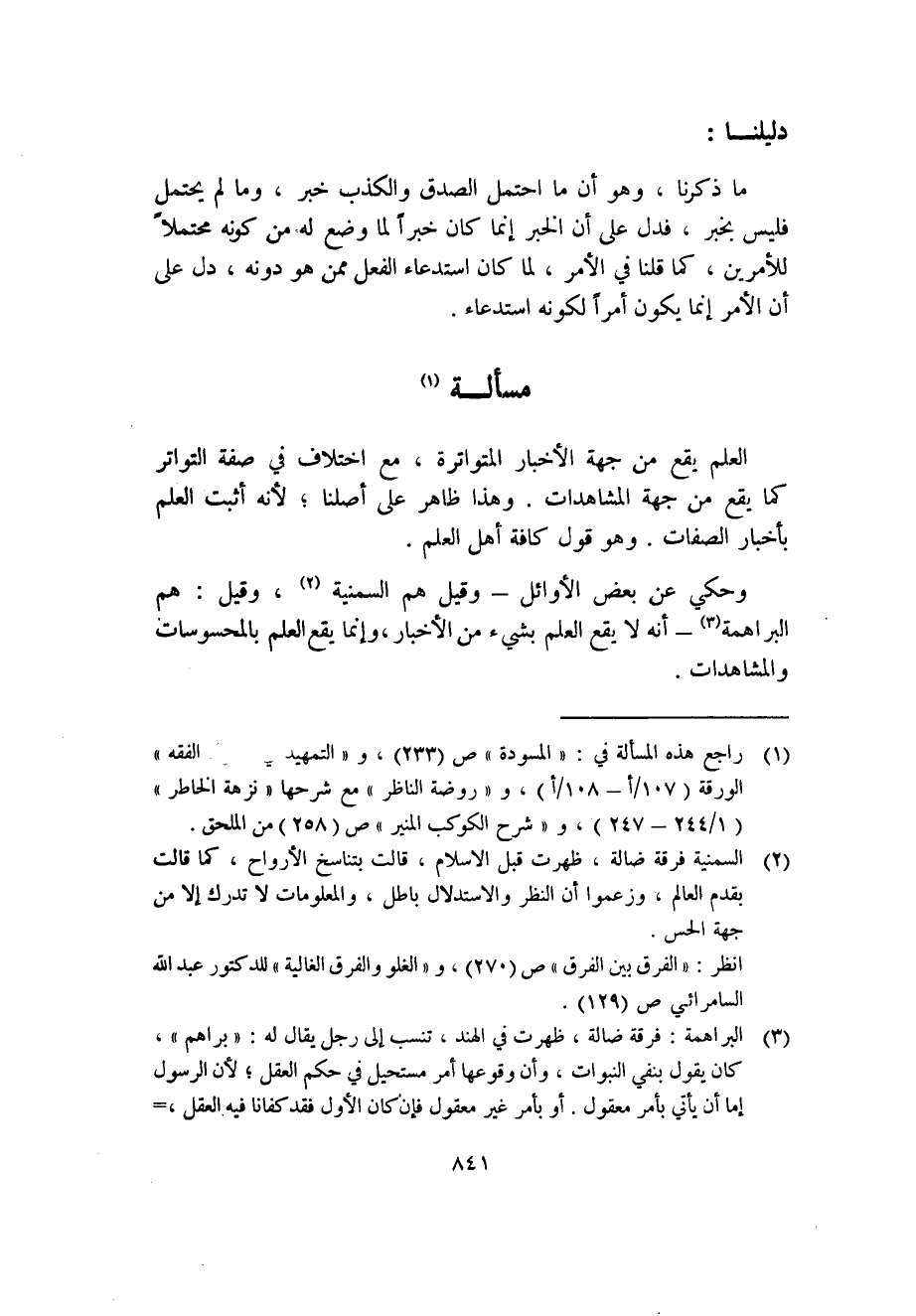 وحكي عن بعض الأوائل -وقيل هم السمنية (2) ، وقيل: هم البراهمة (3) - أنه لا يقع العلم بشيء من الأخبار، وإنما يقع العلم بالمحسوسات والمشاهدات.