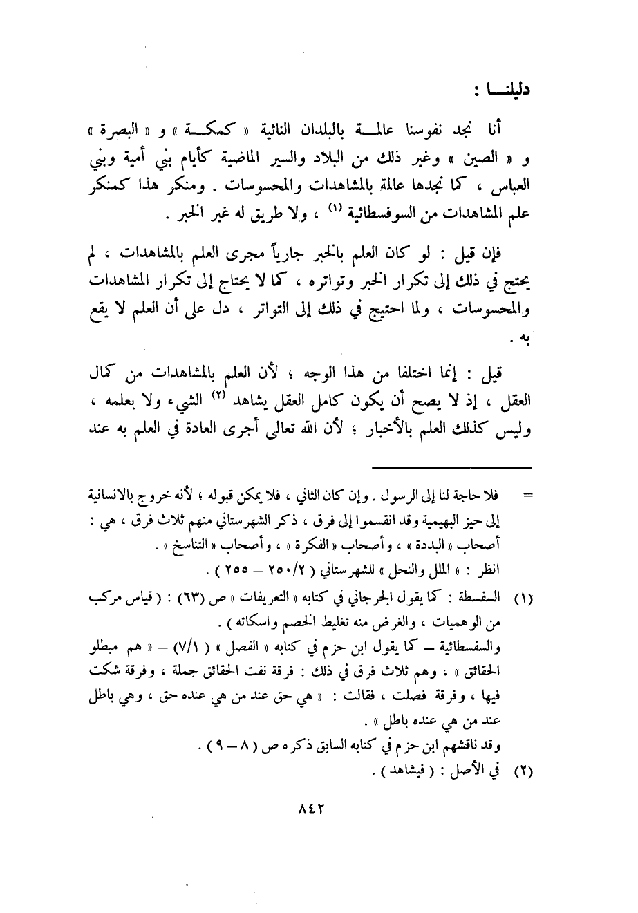 أنا نجد نفوسنا عالمة بالبلدان النائية "كمكة" و"البصرة" و"الصين" وغير ذلك من البلاد والسير الماضية كأيام بني أمية وبني العباس، كما نجدها عالمة بالمشاهدات والمحسوسات. ومنكر هذا كمنكر علم المشاهدات من السوفسطائية (1) ، ولا طريق له غير الخبر.