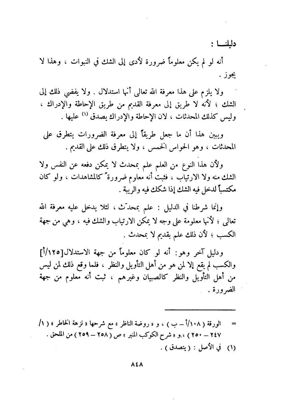 ولأن هذا النوع من العلم علم بمحدث لا يمكن دفعه عن النفس ولا الشك منه ولا الارتياب، فثبت أنه معلوم ضرورة كالمشاهدات، ولو كان مكتسباً لدخل فيه الشك إذا شكك فيه والريبة.