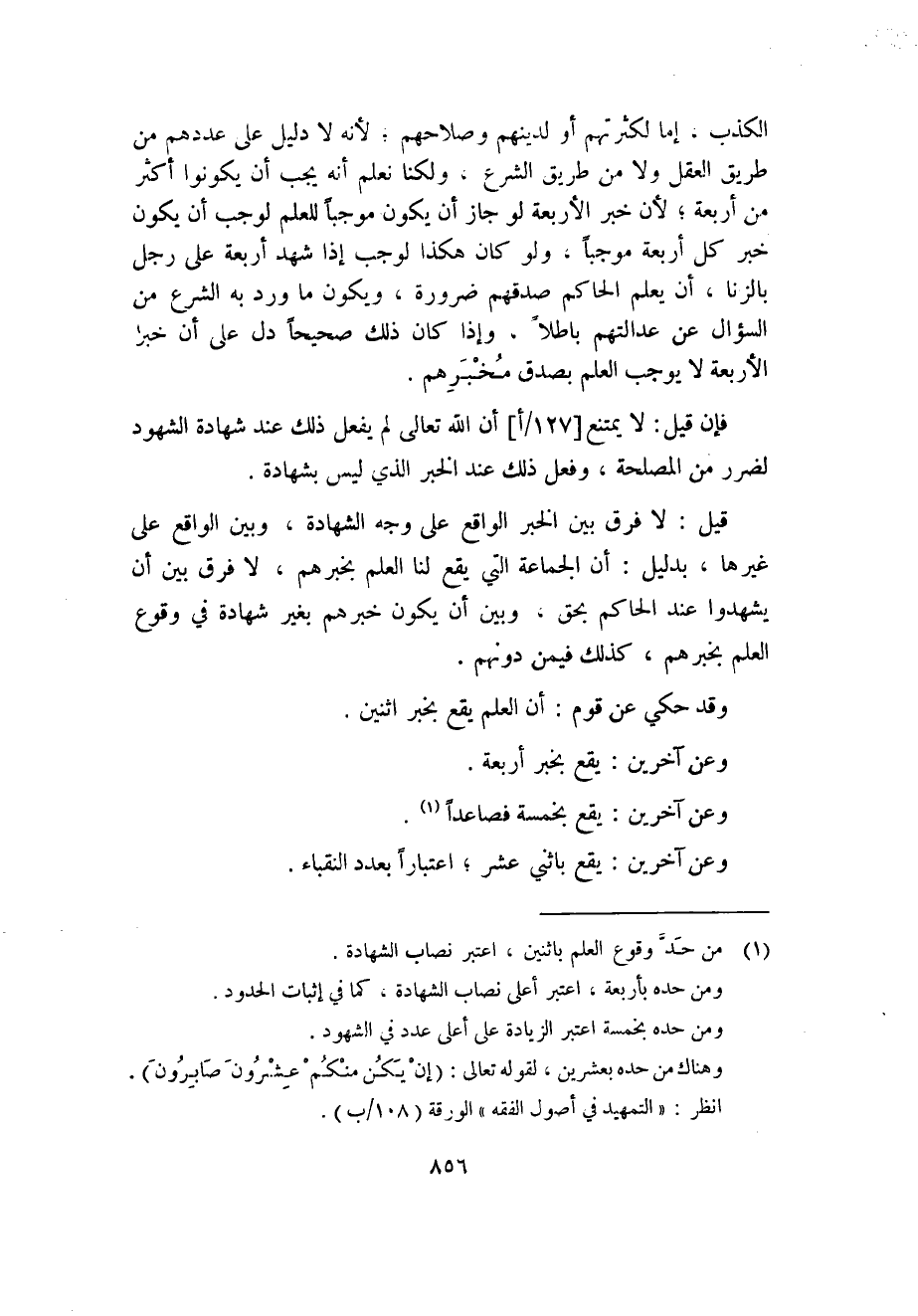 الكذب، إما لكثرتهم أو لدينهم وصلاحهم؛ لأنه لا دليل على عددهم من طريق العقل ولا من طريق الشرع، ولكنا نعلم أنه يجب أن يكونوا أكثر من أربعة؛ لأن خبر الأربعة لو جاز أن يكون موجباً للعلم لوجب أن يكون خبر كل أربعة كل موجباً ولو كان هكذا لوجب إذا شهد أربعة على رجل بالزنا، أن يعلم الحاكم صدقهم ضرورة، ويكون ما ورد به الشرع من السؤال عن عدالتهم باطلاً، وإذا كان ذلك صحيحاً دل على أن خبر الأربعة لا يوجب العلم بصدق مُخبرِهم.