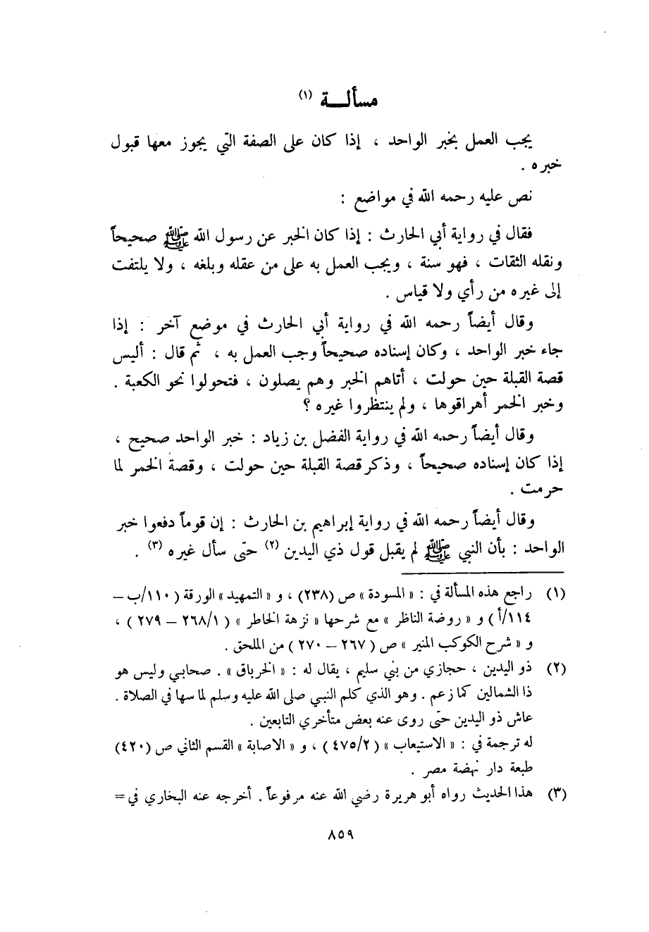 وقال أيضاً رحمه الله في رواية إبراهيم بن الحارث: إن قوماً دفعوا خبر الواحد: بأن النبي - صلى الله عليه وسلم - لم يقبل قول ذي اليدين (2) حتى سأل غيره (3) .