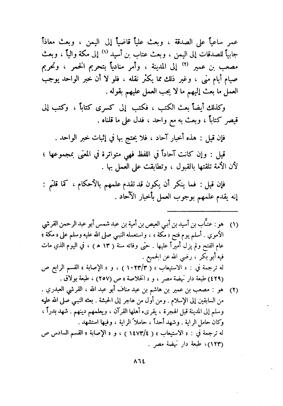 عمر ساعياً على الصدقة، وبعث عليا قاضياً إلى اليمن، وبعث. معاذاً جابياً للصدقات إلى اليمن، وبعث عتاب بن أسيد (1) إلى مكة والياً، وبعث مصعب بن عمير (2) إلى المدينة، وأمر منادياً بتحريم الخمر، وتحريم صيام أيام منى، وغير ذلك مما يكثر نقله، فلولا أن خبر الواحد يوجب العمل ما بعث إليهم ما لا يجب العمل عليهم بقوله.