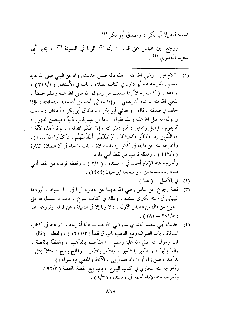 (3) قصة رجوع ابن عباس رضي الله عنهما عن حصره الربا في ربا النسيئة، أوردها البيهقي في سننه الكبرى بسنده، وذلك في كتاب البيوع، باب ما يستدل به على رجوع من قال من الصدر الأول: "لا ربا إلا في النسيئة" عن قوله ونزوعه عنه (5/281-282) .