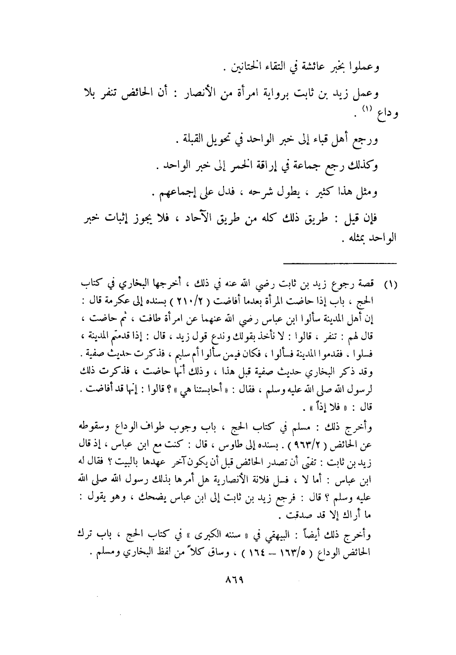(1) قصة رجوع زيد بن ثابت رضي الله عنه في ذلك، أخرجها البخاري في كتاب الحج، باب إذا حاضت المرأة بعدما أفاضت (2/210) بسنده إلى عكرمة قال: إن أهل المدينة سألوا ابن عباس رضي الله عنهما عن امرأة طافت، ثم حاضت، قال لهم: تنفر، قالوا: لا نأخذ بقولك وندع قول زيد، قال: إذا قدمتم المدينة، فسلوا، فقدموا المدينة فسألوا، فكان فيمن سألوا أم سليم، فذكرت حديث صفية.