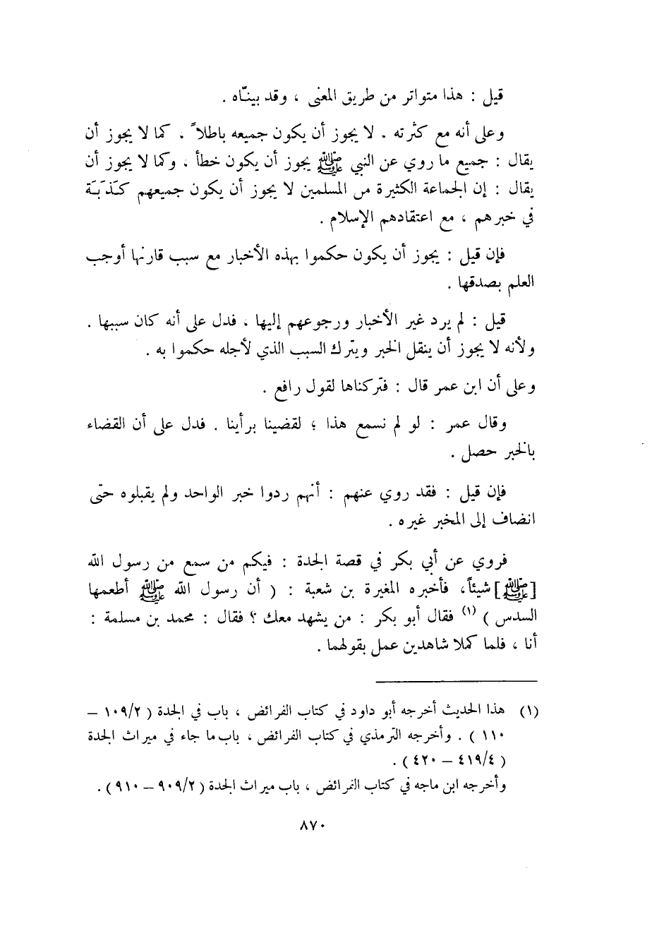(1) هذا الحديث أخرجه أبو داود في كتاب الفرائض، باب في الجدة (2/109-110) . وأخرجه الترمذي في كتاب الفرائض، باب ما جاء في ميراث الجدة (4/419-420) .