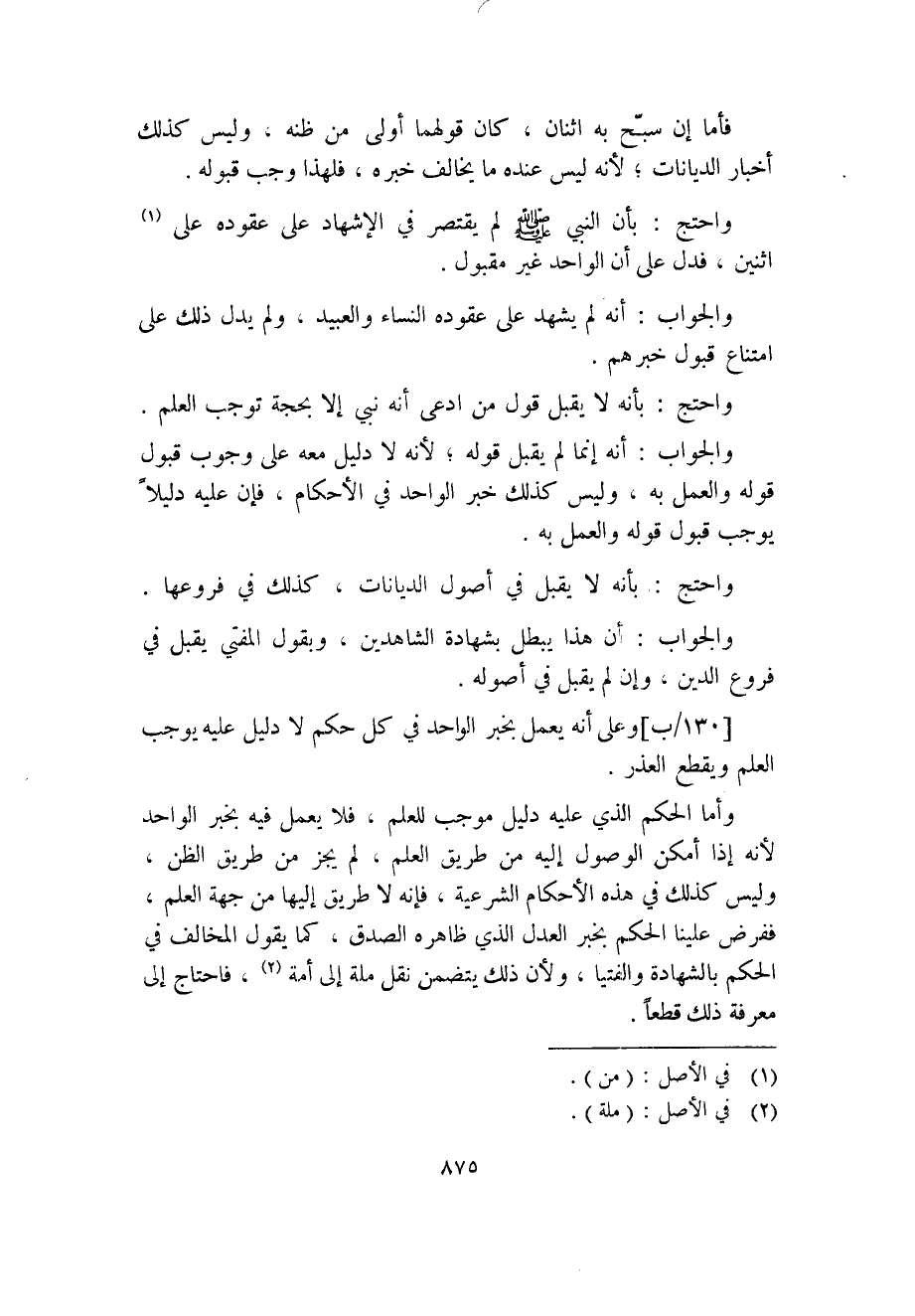 وأما الحكم الذي عليه دليل موجب للعلم، فلا يعمل فيه بخبر الواحد لأنه إذا أمكن الوصول إليه من طريق العلم، لم يجز من طريق الظن، وليس كذلك في هذه الأحكام الشرعية، فإنه لا طريق إليها من جهة العلم، ففرض علينا الحكم بخبر العدل الذي ظاهره الصدق، كما يقول المخالف في الحكم بالشهاة والفتيا، ولأن ذلك يتضمن نقل ملة إلى أمة (2) ، فاحتاج إلى معرفة ذلك قطعاً.